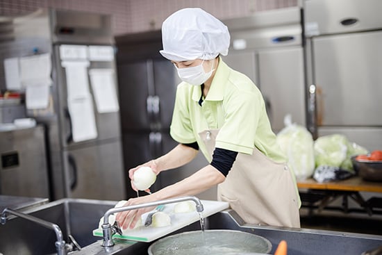 毎日100名分を超える食事を作るにあたり、厨房ではそれぞれのスタッフが協力し合い、やりがいや達成感もあります。安心してかつおいしく食べていただけるよう、調理の仕事を教えてくださった栄養士の方の姿勢を見て、私も同じように仕事をしていきたいと思っています。